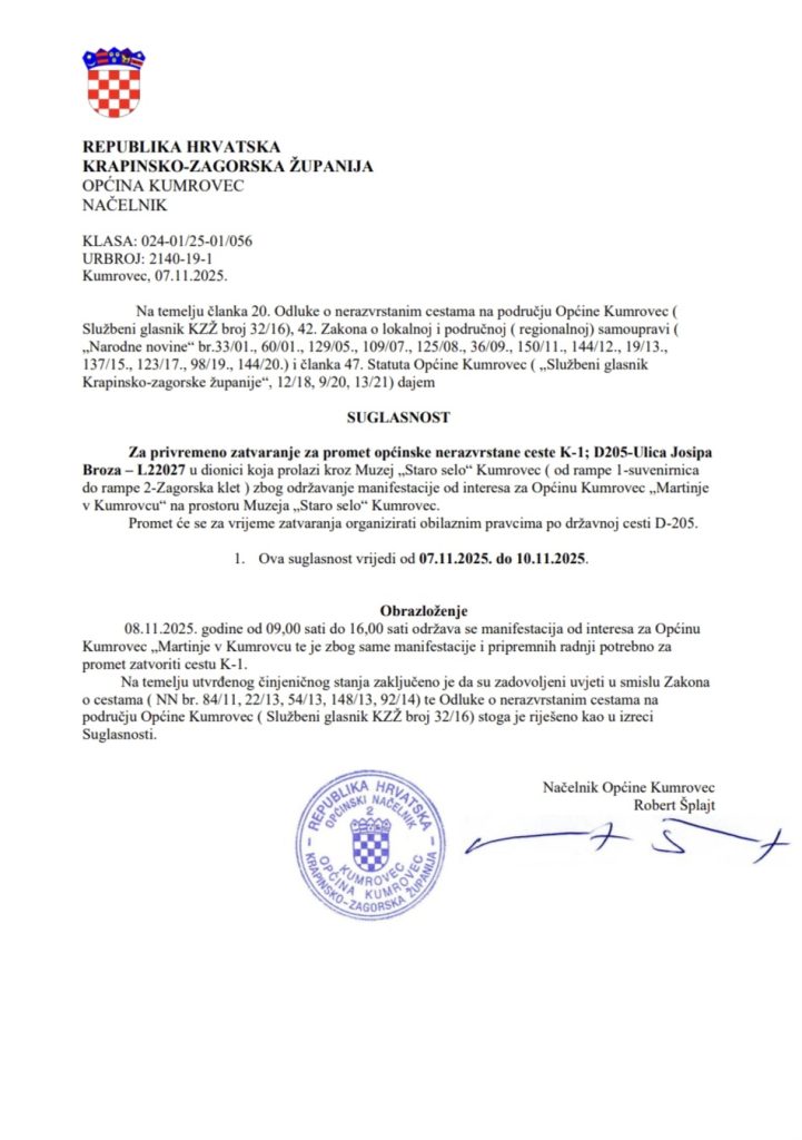 Privremeno zatvaranje prometnice – Martinje v Kumrovcu
